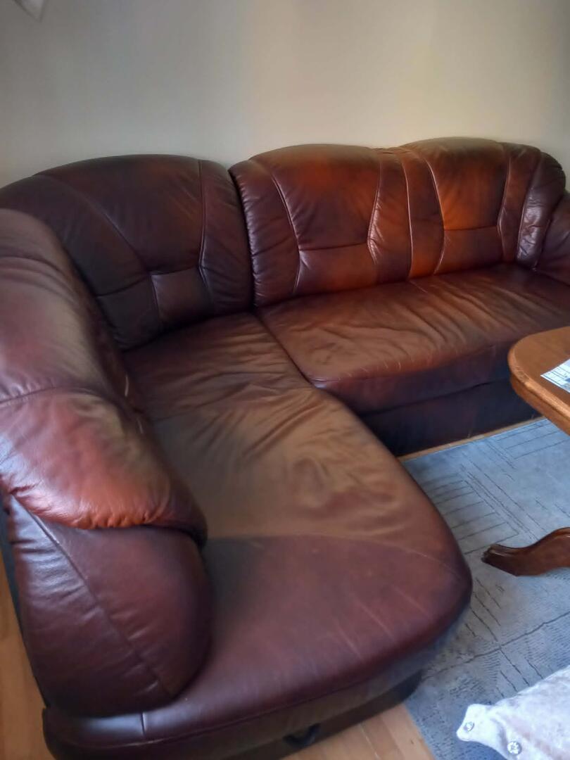 Sprzedam narożnik z dobrej skóry w brązowym kolorze.Kanapa jest bez uszkodzeń mechanicznych ,są natomiast widoczne niewielkie przebarwienia na siedzisku .Ogólny stan jest dobry.